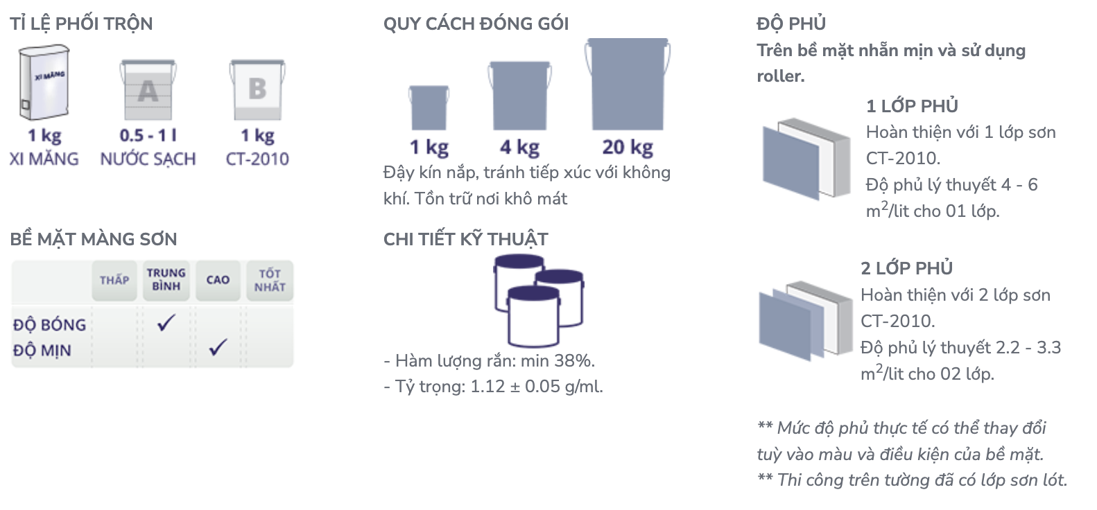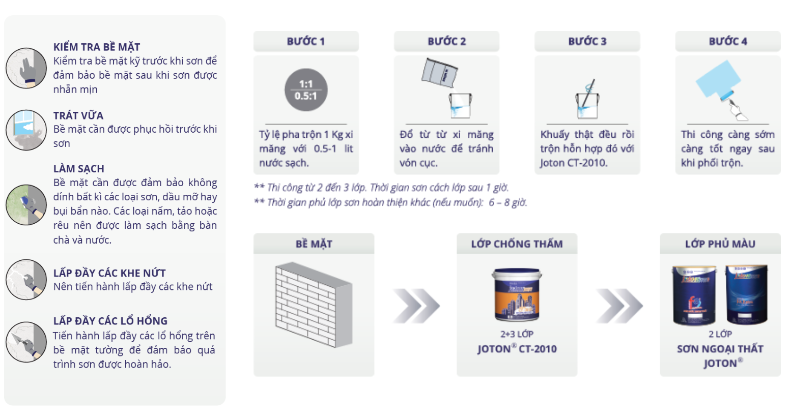 JOTON­® CT-2010 là loại sơn chống thấm hệ nước kết hợp với xi măng. Loại sơn này có tác dụng ngăn sự thấm nước từ bên ngoài vào nhưng màng sơn vẫn bốc hơi nước dễ dàng. Có thể sử dụng như một chất kết dính để trám các vết nứt và khe hở nhỏ trên bề mặt bê tông. JOTON­® CT-2010 chuyên sử dụng để chống thấm cho bê tông, nền, tường xi măng, bể nước, sân thượng, bờ tường, nhà tắm, sê nô, sàn nhà vệ sinh, …