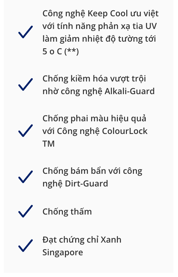 Điều kiện thi công: Độ ẩm của bề mặt dưới 16% theo máy đo độ ẩm Protimeter hay để bề mặt tường khô từ 21 đến 28 ngày trong điều kiện bình thường (nhiệt độ trung bình 30 độ C, độ ẩm môi trường 80%). Không sơn nếu nhiệt độ thời tiết dưới 10 độ C. Bảo đảm bề mặt sơn phải sạch, khô, không có tạp chất làm giảm độ bám dính như bụi, dầu mỡ hay sáp. Dùng hóa chất thích hợp để xử lý bề mặt có rêu mốc. Đối với bề mặt cũ bị phấn hóa, cần loại bỏ màng sơn cũ bằng dụng cụ thích hợp trước khi thi công. Xử lý triệt để các vết nứt tường trước khi thi công.