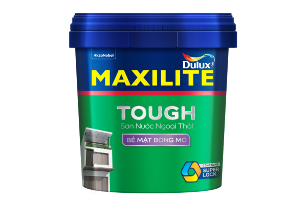 MAXILITE TOUGH TỪ DULUX_Bề mặt Bóng Mờ là sơn nước ngoại thất chất lượng cao với thành phần nhựa gốc Polymer và công nghệ SuperLock giúp màng sơn bám dính chắc chắn vào tường, ngăn ngừa bong tróc hiệu quả và cho màu đẹp lâu hơn với bề mặt láng mịn.