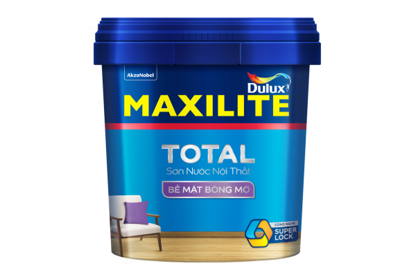MAXILITE TOTAL TỪ DULUX_Bề mặt Bóng Mờ là sơn nước nội thất chất lượng cao với thành phần nhựa gốc Polymer và công nghệ SuperLock giúp màng sơn bám dính chắc chắn vào tường, ngăn ngừa bong tróc hiệu quả và cho màu đẹp lâu hơn với bề mặt láng mịn.