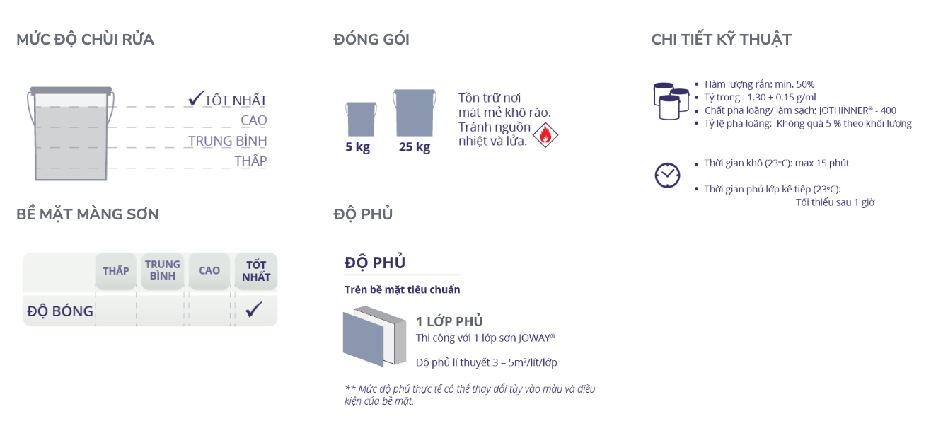 JOWAY® là một loại sơn đặc biệt dùng cho giao thông, gốc nhựa Acrylic. JOWAY® có tính kháng nước, kiềm, xăng dầu và chịu mài mòn cao.